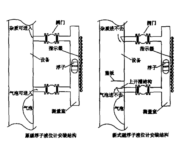 這樣,氣相就不能代替下連接管中的液相,也不能進(jìn)入液位計(jì)的測(cè)量室,從而避免了氣泡對(duì)測(cè)量的干擾和“隨機(jī)磁”現(xiàn)象磁翻板液位計(jì)新安裝結(jié)構(gòu)的上下連接管采用非鐵磁性不銹鋼,避免連接管被浮子強(qiáng)磁場(chǎng)磁化。上部連接管略微伸入設(shè)備內(nèi),管端做成向下的凹槽,防止掉下的雜質(zhì)進(jìn)入連接管;由于e型槽孔結(jié)構(gòu),雜質(zhì)容易落入下部連接管中,因此必須在T型槽孔結(jié)構(gòu)上部適當(dāng)位置加蓋板。只要槽的角度和蓋板的位置、尺寸合適,就可以防止鐵磁性雜質(zhì)進(jìn)入連接管,防止浮漿現(xiàn)象。