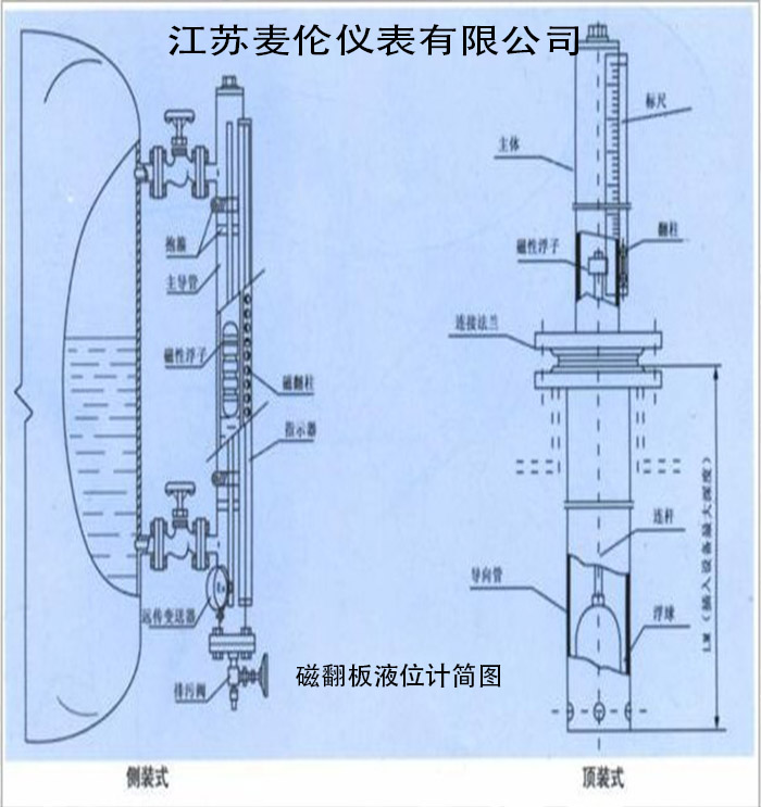 磁翻板液位計的安裝方式有兩種,側裝式磁翻板和頂裝式磁翻板,頂裝式磁翻板液位計是安裝于槽罐的頂部,是通過一個法蘭與罐體連接。側裝式磁翻板液位計是安裝于槽罐的側面,通過上下兩個連通管,以法蘭的形式也槽罐接連在一起,厘清這一點,我們就知道了,頂裝式磁翻板液位計不存在中心距的問題,只有側裝式磁翻板液位計才有中心距,磁翻板液位計的中心距簡略來說中心距就是指(豎直側裝)上端法蘭中心孔與下端法蘭中心孔之間的距離,而這個兩法蘭中心之間的距離一般就是指液位測量范圍量程。比如現場液位測量范圍是3米。
