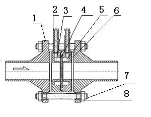 1、法蘭 2、導壓管 3、前環室 4、節流件 5、后環室 6、密封墊片 7、螺栓 8、螺母