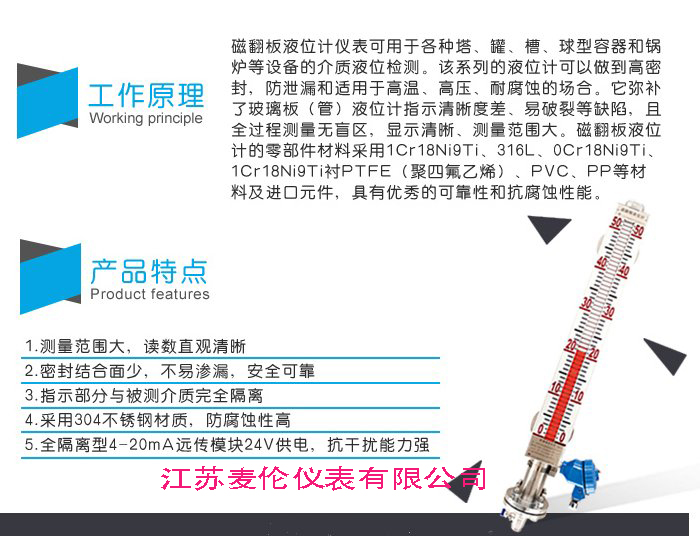 磁翻板液位計由本體、翻板盒(由紅白磁性小翻板組成)、浮子、法蘭蓋等組成,用于各種液體容器的液位測量。磁翻板液位計可用于高溫、防爆、防腐、食品飲料等場合顯示或遠程顯示和控制液位。磁翻板液位計能在高溫、高壓、高粘度和強腐蝕條件下實現(xiàn)高密封性、防泄漏和液位測量。