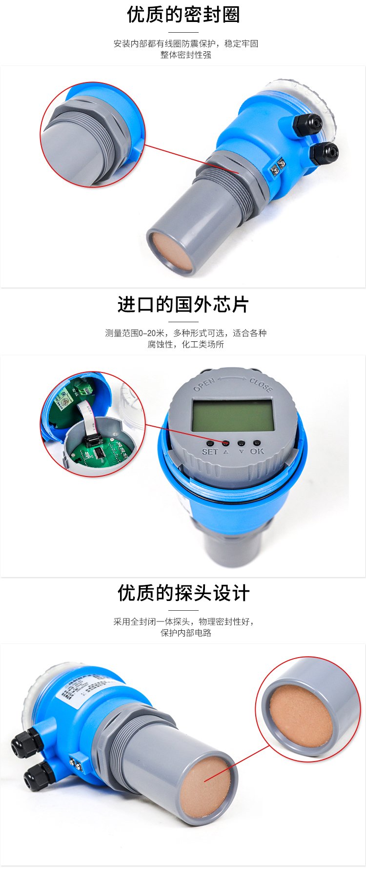 從而影響測量精度;如有必要,可增加波導(dǎo)管,其長度可與液位一樣低。應(yīng)確保管內(nèi)外液位能自由同步升降,內(nèi)壁應(yīng)光滑;在有水蒸氣的場合,盡量不要使用超聲波液位計。因為如果有蒸汽,很容易在探頭表面形成水滴,這將影響儀器的正常測量;露天安裝時安裝遮陽板(雨罩)。