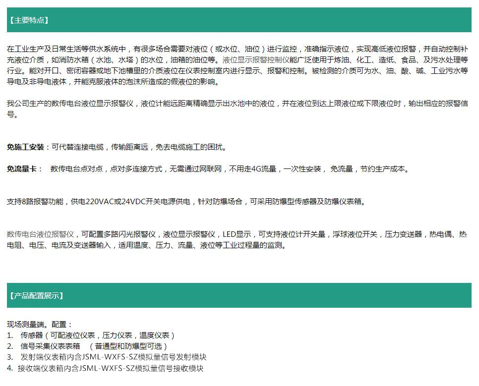 在工業生產及日常生活等供水系統中,有很多場合需要對液位(或水位、油位)進行監控,準確指示液位,實現高低液位報警,并自動控制補充液位介質,如消防水箱(水池、水塔)的水位,油箱的油位等。液位顯示報警控制儀能**使用于煉油、化工、造紙、食品、及污水處理等行業。能對開口、密閉容器或地下池槽里的介質液位在儀表控制室內進行顯示、報警和控制。被檢測的介質可為水、油、酸、堿、工業污水等導電及非導電液體,并能克服液體的泡沫所造成的假液位的影響。 我公司生產的數傳電臺液位顯示報警儀,GPRS無線液位顯示報警儀液位計能遠距離精確顯示出水池中的液位,并在液位到達上限液位或下限液位時,輸出相應的報警信號。 |