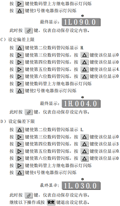 偏差上限是指超過上限的偏差值,實際報警值=上限+偏差上限。例: 上限為115.0℃,偏差上限為4.0℃ 實際報警值=115+4=119℃ 偏差下限是指超過下限的偏差值,實際報警值=下限-偏差下限。