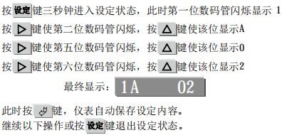 小數點位置的提示符是:d,在設定顯示范圍前,先設定小數點位置。小數點位置設定代碼范圍是0~3,其含義是0對應個位〔第六位數碼管〕,1對應十位〔第五位數碼管〕,2對應百位〔第四位數碼管〕,3對應千位〔第三位數碼管〕。從例二中我們看到顯示范圍是-100.0~100.0℃,小數點位置在十位上,也就是說在第五位數碼管上顯示,其對應代碼是1。因此按以下操作進行小數點位置設定。