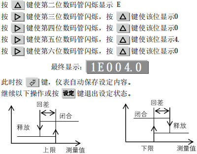 小長圖有紙記錄儀上下限報警繼電器的觸點是給用戶聯接相應的控制電器[如電 磁閥]以組成控制系統時使用。為了防止在報警點附近繼電器觸點產生抖 動現象,儀表采用設定回差的方法,以消除繼電器觸點抖動。其提示符是:E