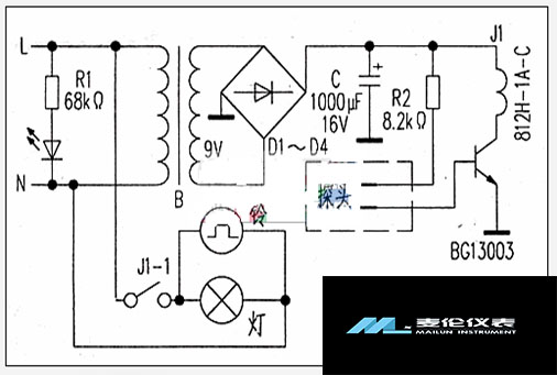 市電經變壓器B耦合到次級,經整流、濾波后,電容C二端產生12v的直流電壓。此電壓通過繼電器線圈加到三極管集電極上。