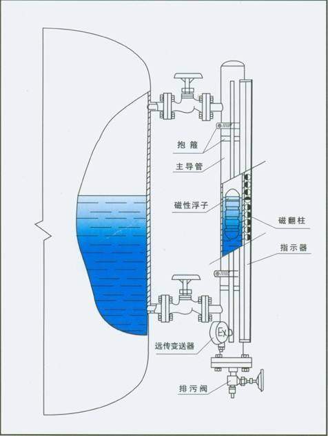 根據(jù)浮力和磁耦合原理,測量筒(即連通器)內(nèi)磁性浮子隨被測液面的升高(降低)驅(qū)動測量筒外部顯示器上的雙色磁翻板翻轉(zhuǎn)。