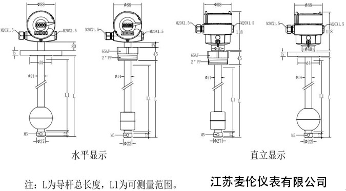 一般來講,標準型浮球液位計共有四種結(jié)構(gòu)尺寸,如上圖所示。圖中左一和左二為水平顯示,左三和左四為直立顯示。上圖左一型號的浮球液位計,其過程連接為法蘭連接,導(dǎo)桿尺寸為Φ21*2,表頭距離法蘭為80mm,浮球為大球。上圖左二型號浮球液位計,其過程連接為螺紋連接,導(dǎo)桿尺寸為Φ14*1,表頭距離螺紋為20mm,浮球為小球。上圖左三型號的浮球液位計,其過程連接為螺紋連接,導(dǎo)桿尺寸為Φ21*2,浮球為小球,用戶可以從上面看到具體的液位。上圖左四型號的浮球液位計,其過程連接為法蘭連接,導(dǎo)桿尺寸為Φ14*1,浮球為大球。
